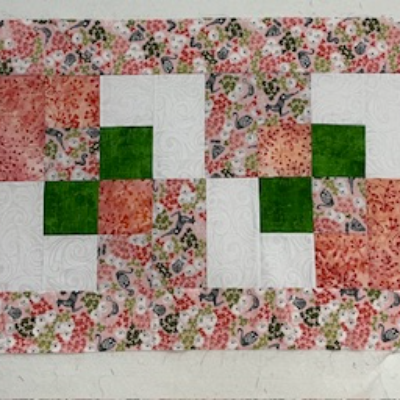 Make a table runner while learning the basics of quilting. Accurate cutting, piecing etc. will be the focus of this beginning class. Fabrics – I used 4 fabrics for this runner. You need 1/2 yard for one of your main fabrics (this one will be your border as well). Then you need 1/4 yard each of two more coordinating fabrics. For the background – which is the white fabric in the picture, you need ½ yard. I like to purchase a little additional fabric in case of cutting errors. That is up to you. For example the 2 fabrics that require ¼ yard – I would purchase 1/3 yard or even ½ yard. Bring your machine (that you know how to use) along with neutral color thread (I use a light gray). Please have a bobbin pre wound before class. You may bring your own notions such as a rotary cutter, cutting mat, a square ruler (12 1/2 inch is best), and basic sewing needs - but if you do not have those, we have them for you to use!